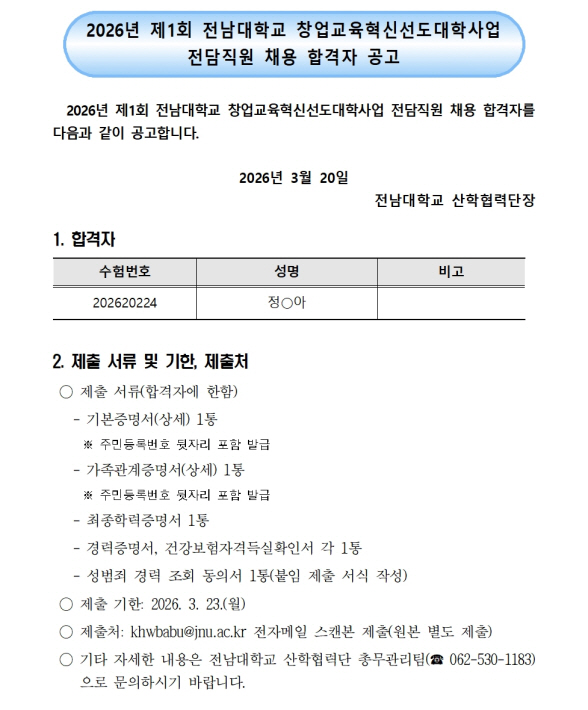2026년 제1회 전남대학교 창업교육혁신선도대학사업 전담직원 채용 합격자 공고